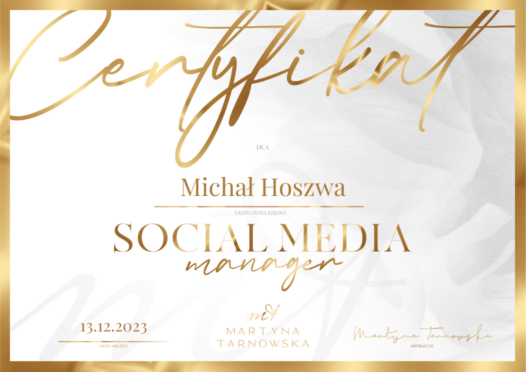 Jako certyfikowany Social Media Manager, zdobyłem doświadczenie w pierwszej szkole SMM w Polsce pod okiem Martyny Tarnowskiej. Po godzinach trenuję sporty walki, a moje zainteresowania obejmują tworzenie wideo, fotografii, grafiki komputerowej i social media oraz latanie dronem. Dodatkowo, jako analityk danych z ponad 8 letnim doświadczeniem korporacyjnym, uwielbiam zagłębiać się w liczby co pomaga mi w dokładniejszej analizie danych i wyciąganiu odpowiednich wniosków. Razem możemy wnieść świeże spojrzenie i kreatywność do Twojego projektu!